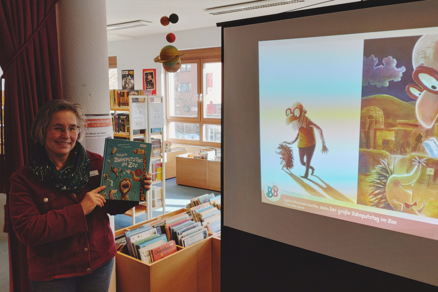 Draußen ist es immer noch kalt, aber in der Bibliothek ist es warm und gemütlich. Der perfekte Tag für das Bilderbuchkino in der Stadtteilbibliothek Hörde. Frau Bernard stellt dort heute das Kinderbuch „Großer Zahnputztag im Zoo“ von Sophie Schoenwald vor.