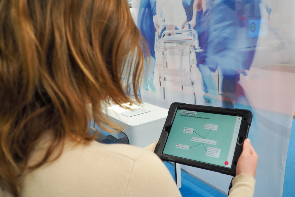 Beim Erlebnisrundgang durch die Ausstellung erarbeiten sich die Schüler*innen eine digitale Mindmap voller Erkenntnisse zum Thema menschenwürdige Arbeit. Dieses Dokument lässt sich flexibel im Unterricht weiterverwenden.