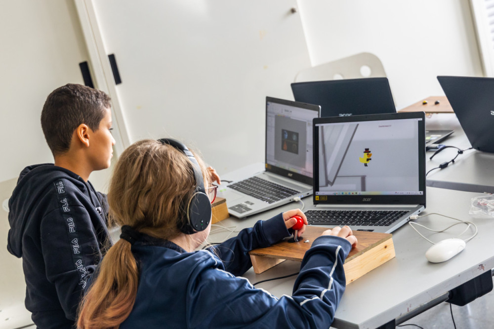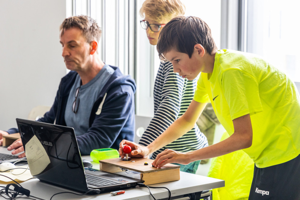 Hier werdet ihr Entwickler*innen eures eigenen Videogames für Internet, Tablet oder Smartphone. Aus Platinen, Kabeln und Buttons baut ihr passende Controller zu euren Games.